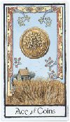 Nøkkelord: Velstand og vekst. Kortet symboliserer konkret virkelighet, materiell rikdom og komfort. Når du får dette kortet kan du regne med bemerkelsesverdig, økonomisk bedring i livet. Det er også viktig å tenke på andre betydninger enn kontanter du kan ta og føle på. Det blir antydet velstand på andre plan; du er kanskje på vei inn i en produktiv fase. Hvis du for eksempel liker å arbeide med hendene, vil du ha stor glede av denne virksomheten nå. Følelsesmessig tyder myntenes ess på trygghet og tilfredshet. Personlige forhold eller arbeidsfellesskap er fredelige, og det hersker en atmosfære av soliditet og stor yteevne.